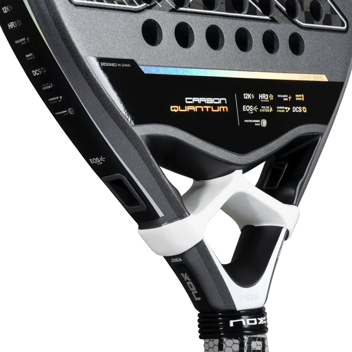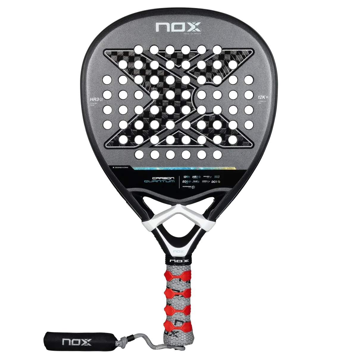 The Nox Quantum Carbon 12K 2025 is a diamond-shaped padel racket designed for intermediate to advanced attacking players who prioritize explosive power. It offers a firm yet comfortable medium-hard feel, featuring technologies that enhance maneuverability and spin for aggressive control on the court.